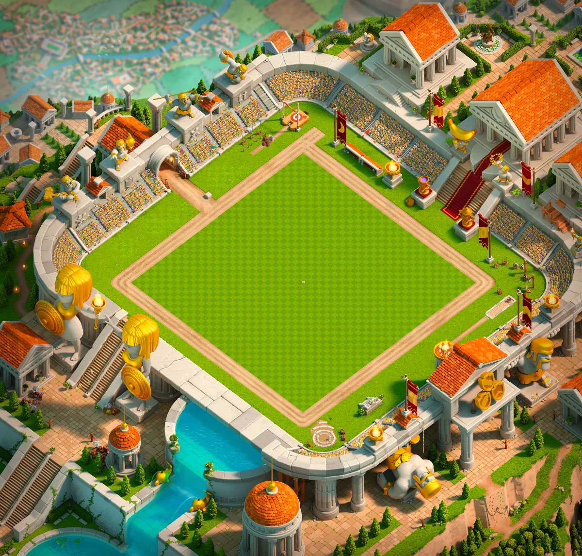منظره 🎯 Clash Games Scenery درکلش یکی از جدیدترین و خاصترین منظرههاست که با حالوهوای رقابتی و ورزشی طراحی شده. این منظره به شکل یک استادیوم المپیکی با تم رم باستان ساخته شده و مخصوص فصل جولای ۲۰۲۴ هست.